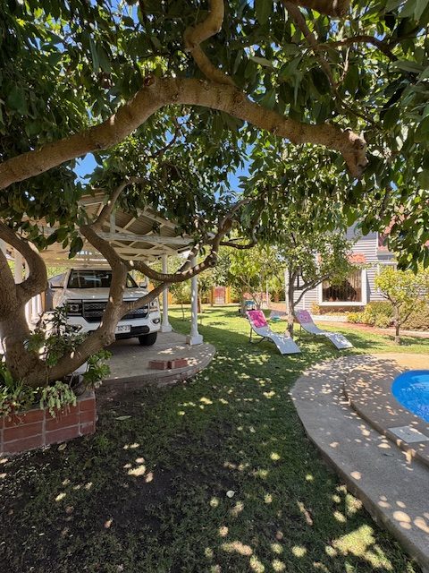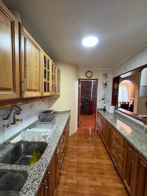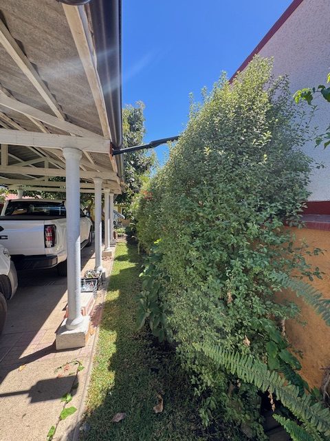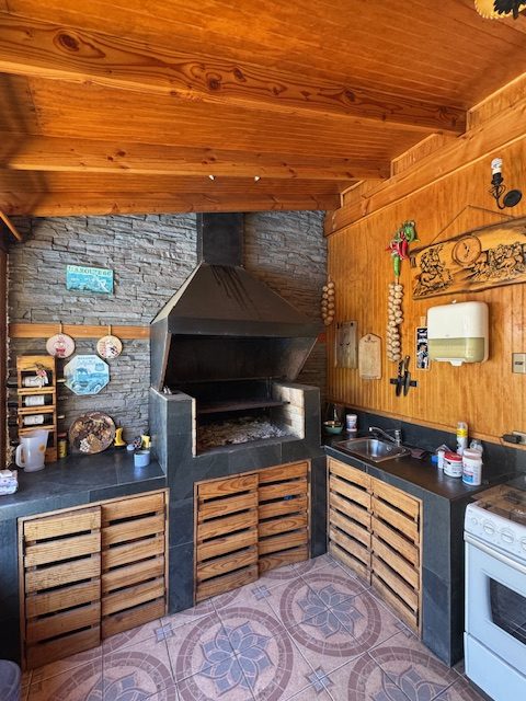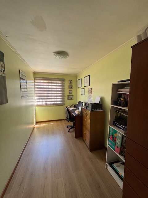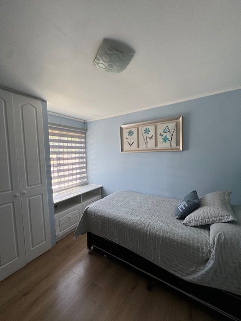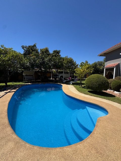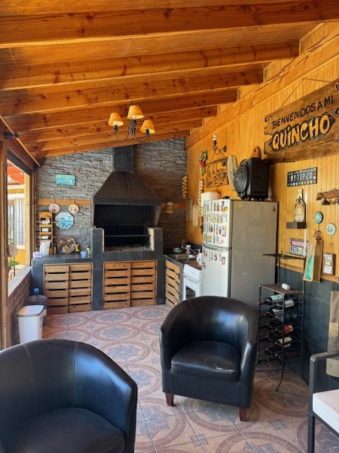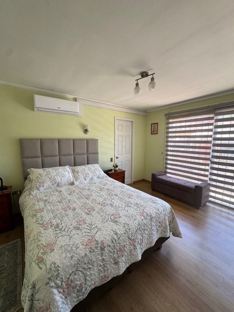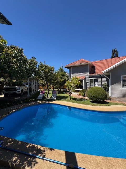 La vivienda de 2 pisos, con excelente orientación, muy soleada, de construcción mixta (albañilería y tabiquería), cuenta con amplio living y comedor, con vigas a la vista, aplicaciones en piedra, estufa de combustión lenta por pellets, amplia cocina amoblada y equipada con muebles modernos de madera y cubiertas de granito, doble lavaplatos, espacio para refrigerador grande y para cocina de 6 quemadores, conectada con cómodo comedor de diario, y salida a la logia techada de 14 metros cuadrados, con instalación para lavadora y secadora. 3 dormitorios con closet, 2 baños completos (uno en el dormitorio en suite), escalera de caracol al segundo piso en donde dispone de un gran dormitorio con un baño completo, en suite. Piso termolaminado en toda la casa, Piso de cerámica en cocina y baños. Vivienda principal de 110 metros cuadrados. Cuenta con departamento independiente, de 40 metros cuadrados, con un amplio dormitorio con closet y baño completo en suite, que sirve para el Quincho y la Piscina. Quincho de 20 metros cuadrados, con parrilla, campana y equipamiento. Con cierre con persianas eléctricas y manuales, conectado con el hermoso patio y la piscina. 2 bodegas cerradas de excelente construcción, independientes de 15 metros cuadrados en total. Toda la casa cuenta con protecciones metálicas, alarma y cámaras de vigilancia. Excelentes cierres perimetrales. Aire acondicionado en suite, dormitorio del segundo piso y en el departamento exterior. Piscina de hormigón de 30 metros cúbicos, con fulget, y equipamiento de bomba y filtro. Ante jardín y patio con césped, riego tecnificado, árboles y arbustos ornamentales, y árboles frutales (paltos, limones, papayo, naranjos, peral, manzano, níspero y chirimoyo). 2 accesos independientes para estacionamientos, con portón eléctrico, uno techado para 2 a 3 vehículos y otro para un vehículo. Superficie de 600 metros cuadrados de terreno. Cuenta con Recepción Municipal.