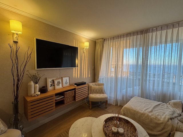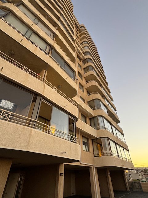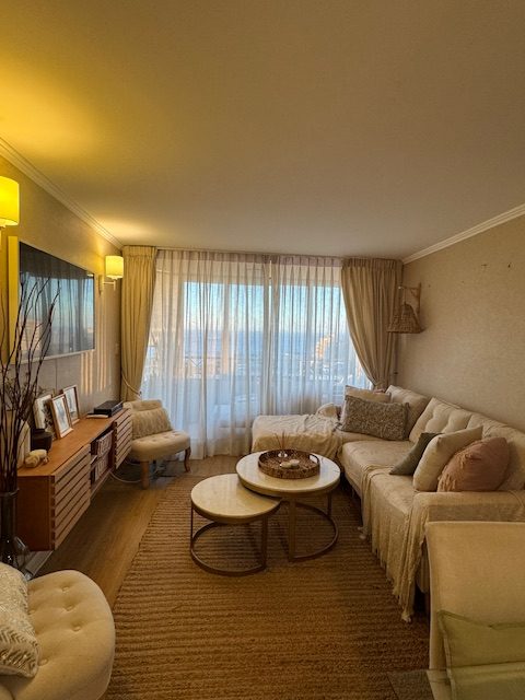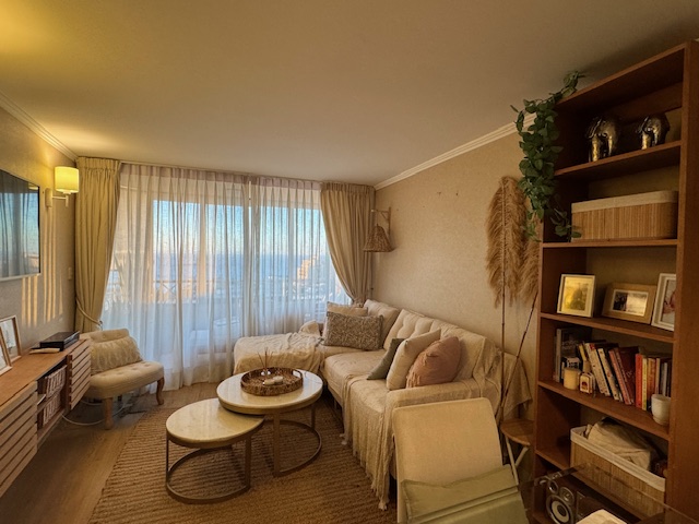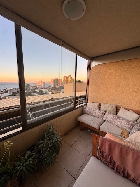 Lindo, cómodo, soleado y acogedor departamento, con vista al mar, ubicado en Lord Cochrane, a 3 cuadras de Avenida Diego Portales, a pasos del Estadio Español, con excelente conectividad a la Avenida España y a Avenida Agua Santa. Cuenta con hall de entrada, living comedor con terraza (vidriada), cocina independiente con logia, amoblada y equipada con horno y campaña eléctrica y encimera a gas, 2 amplios dormitorios, con closet y vista a la Bahía, dormitorio principal en suite y amplia terraza y 2 baños completos con tina (uno en suite). Superficie aproximada de 65 metros cuadrados más 12 metros cuadrados en terrazas. Dispone de un estacionamiento techado y de una bodega. El edificio cuenta con acceso controlado por conserjería 24 horas, hall de entrada, 2 ascensores, sala multiuso con baño y cocina y patio para usos múltiples. Gastos comunes aproximados $120.000.- (precio UF. 5.150). Amoblado opcional.
